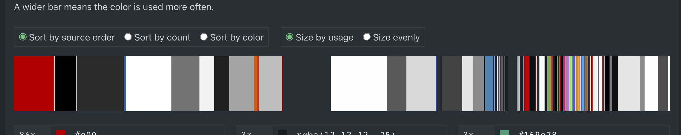 Somewhere down the page there are some colors lists. They’re basically a small <canvas> where we render all known colors too. For websites with many colors this can be quite intensive, so I gave this the same treatment as the ScatterPlots: only when the Colors section of the report is scrolled into view, these canvases are rendered.