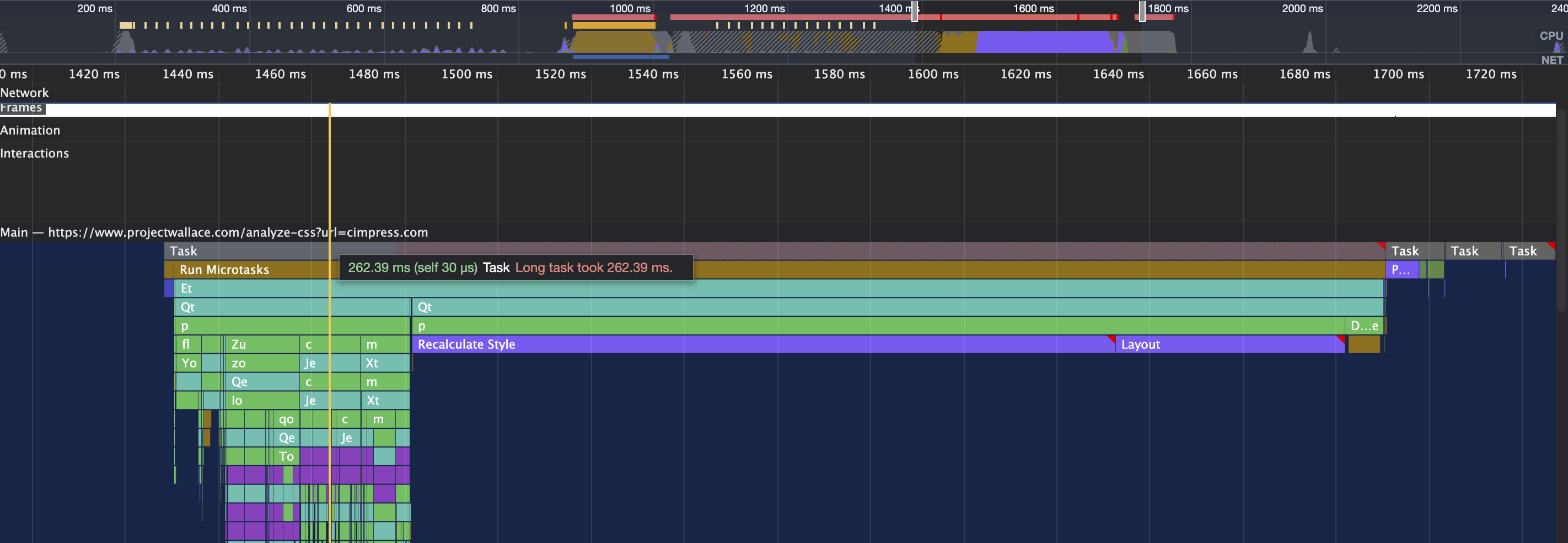 The image also shows two big blocks of Recalculate Style and Layout, taking up 150ms and 50ms. I have yet to find out what they mean, but I think it’s the document trying to paint the generated report to screen. The tall block on the left is what would previously take up all space and look at it now: it’s tiny in comparison.